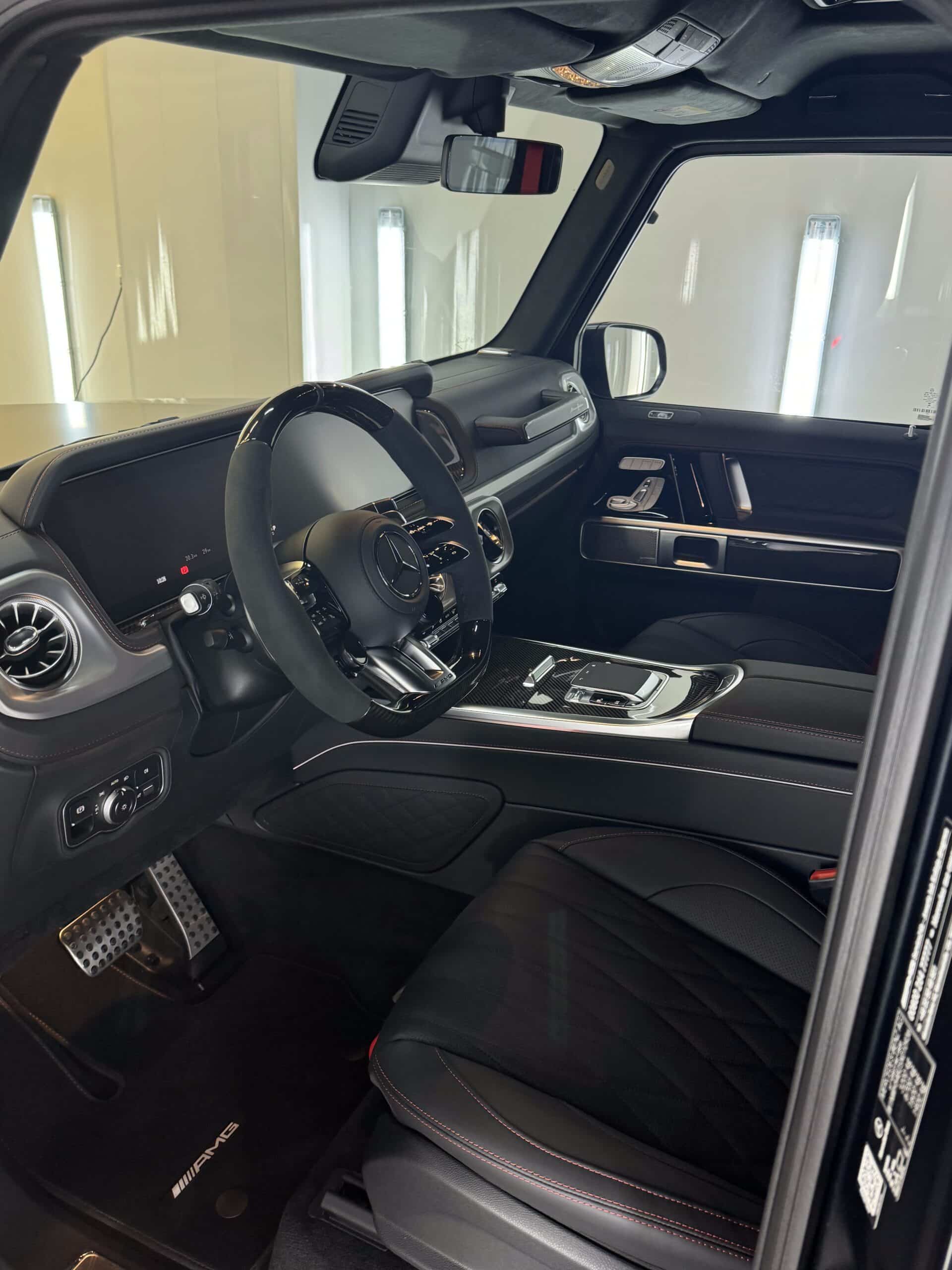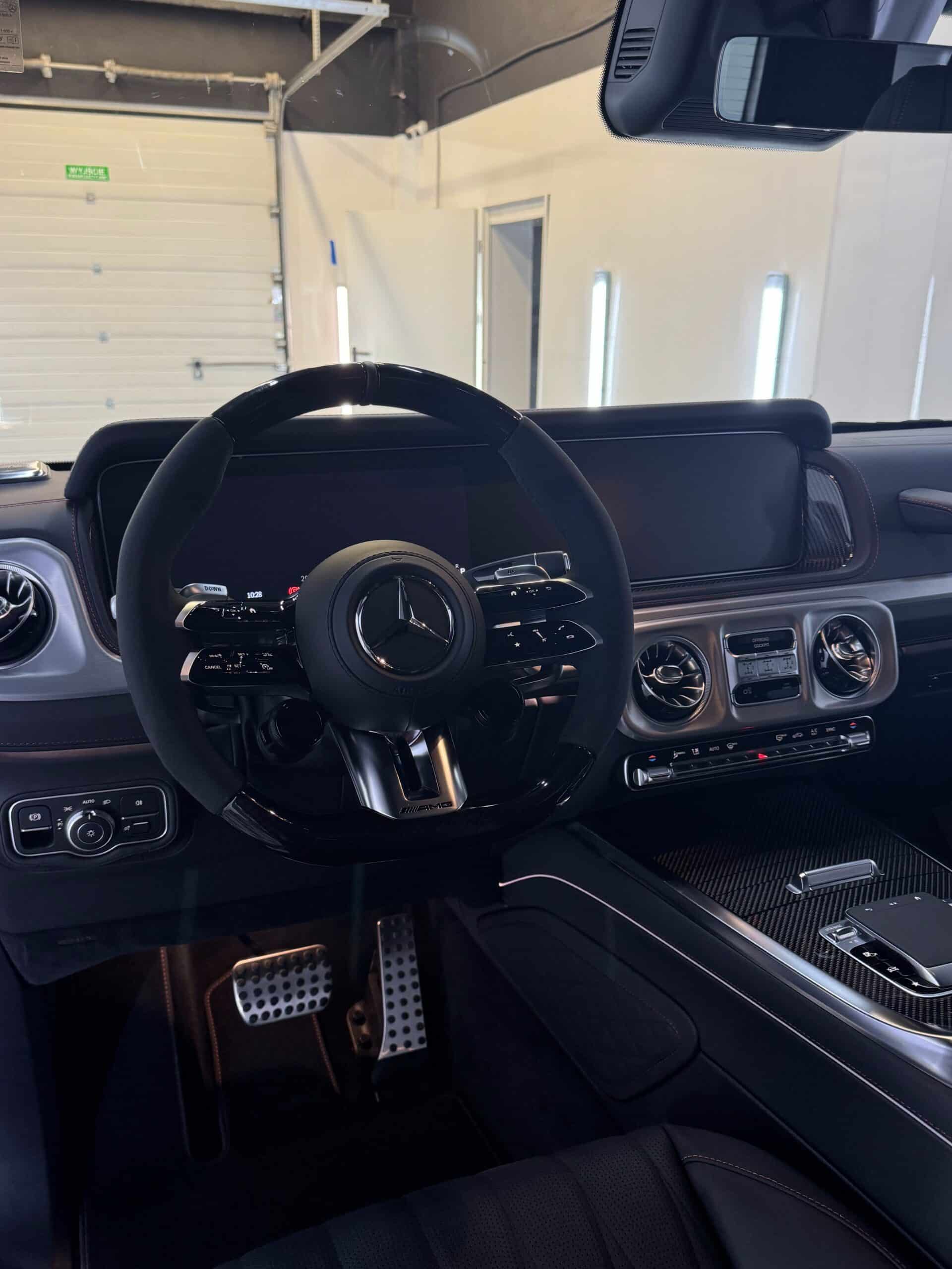 Dopełnieniem tej przemiany był totalny dechroming – wszystkie srebrne elementy zastąpiliśmy głęboką czernią Piano Black, co w połączeniu z proszkowo malowanymi progami nadało sylwetce spójnego, mrocznego wyglądu. Nie pominęliśmy również wnętrza, gdzie delikatne dekory Piano Black zostały precyzyjnie zabezpieczone, aby cieszyły oko nienagannym stanem przez lata. Ten Mercedes to teraz idealne połączenie unikalnej estetyki z najwyższym stopniem ochrony.